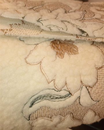 Lækker blød quilt i beige natur farve med mærkbart blomster mønster i teddy plys. Begge ægkanter er afsluttet med en råhvid teddy kant som rækker ca. 10 cm op.