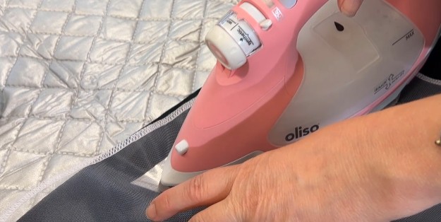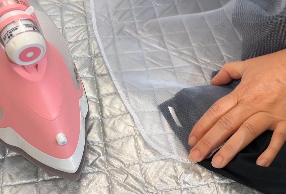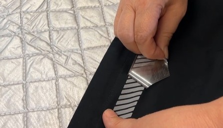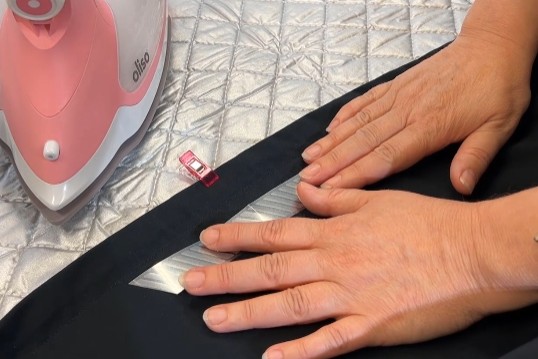 Når stoffet har klaret testen, vælg hvor du vil placere refleksen – f.eks. tværs over ryggen på en jakke eller langs benet på løbebukser. Brug folien på refleksbåndet til at holde det lige, og fold evt. en lille markering i midten for korrekt centrering.
