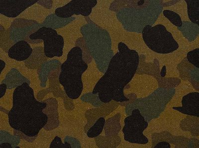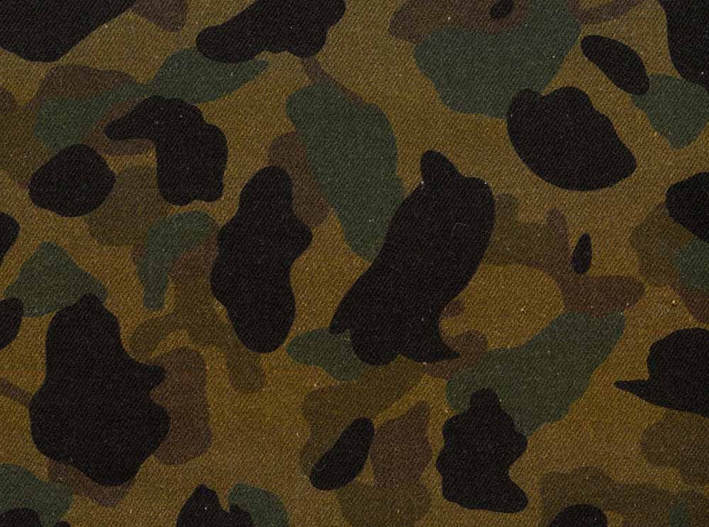 Kraftig bomulds denim stof i grønbrun baggrund med kamouflage mønster.