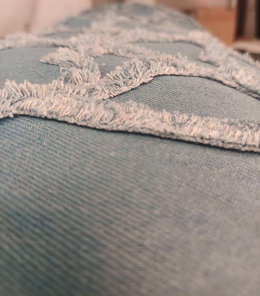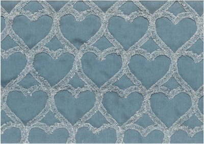 Fastvævet blød kraftig bomulds denim/jeans i lys blå med påsyet chenille hjerter for at give en fed effekt.
