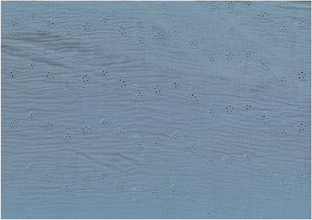 Fastvævet double gauze i støvet blå med sødt hul broderi mønster.