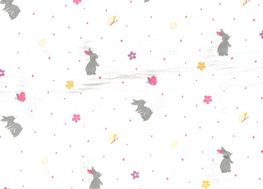 Fastvævet double gauze i hvid med søde kaniner i grå og lidt blomster og sommerfugle.