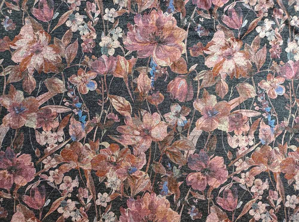 Lækker blød jersey i duset blomster mønster på mørkegrå baggrund og med næsten velour blød front.