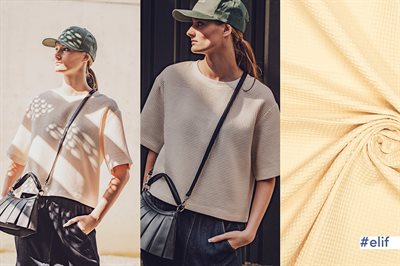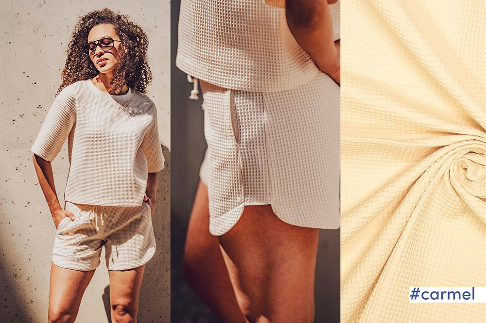 Elif Carmel Waffle Beige er et fastvævet bomuldsstof med vaffel struktur i helt lys cremet beige farve.