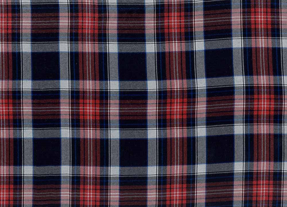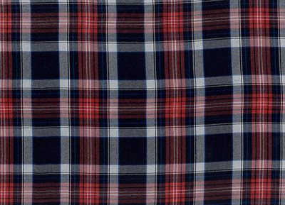 Fastvævet blød bomuldsstof i helt mørkeblå med tern i blå, hvid og rød.