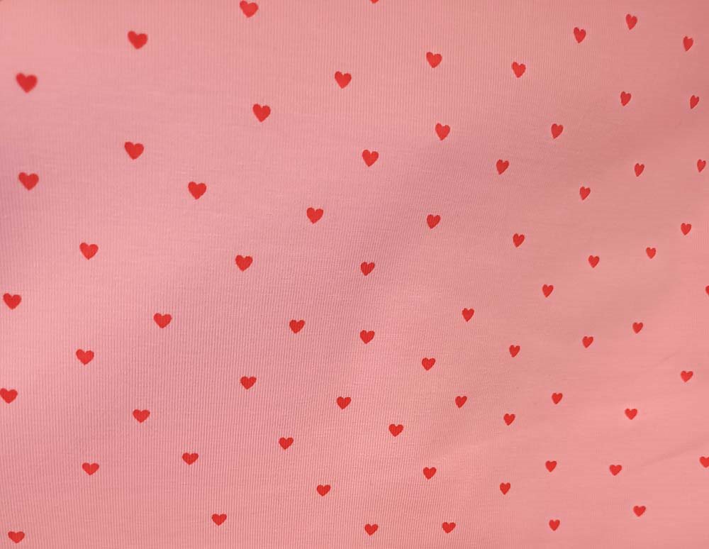 Blød bomulds jersey i klassisk lyserød med små røde hjerter.