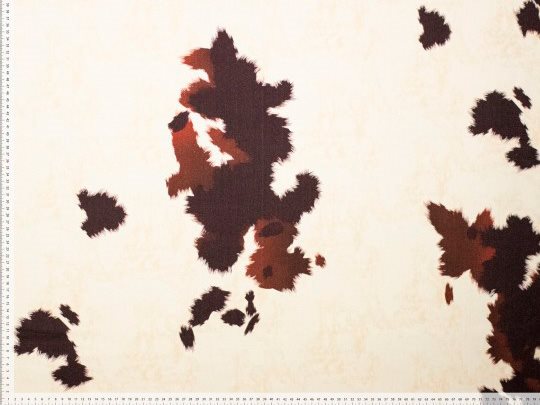 Fastvævet blød bomulds denim/jeans i meleret råhvid med store brune ko pletter.