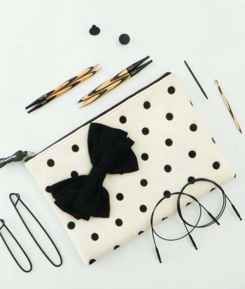 Sættet leveres i et elegant og sofistikeret etui med et charmerende prikket design og en markant sort sløjfe.