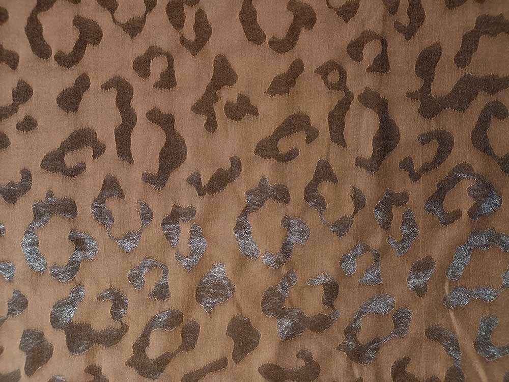 Fast jacquard vævet stof i brun med leopard print der skinner lidt og flot blødt fald.