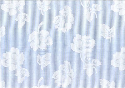 Fastvævet blød og let og en anelse transperant bomuldsstof med smalle mellemblå og hvide striber og hvide trykt blomster.