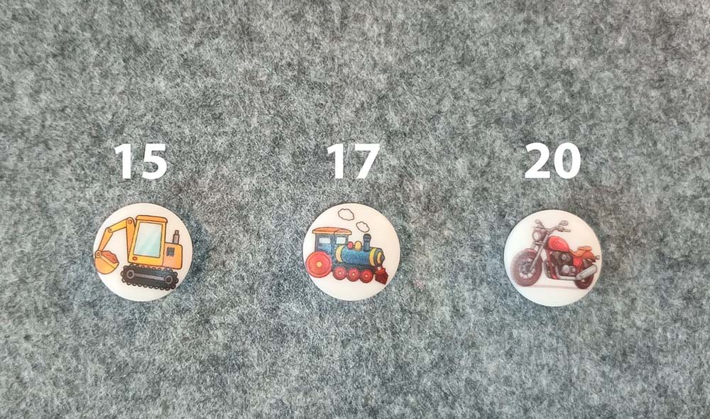 Forside › Sytilbehør › Knapper og Pynt Motorkøretøj knap 16mm Varenummer: 17181 Knap med motorkøretøjer. Knapper i hvid plast med motorkøretøj motiv, enten en minigraver, tog eller motorcykel i Ø 16mm. Se billede to for øje bagpå til påsyning. Fv. Vælg variant 12,00 DKK pr. stk.inkl. moms Antal Køb Tilføj til Ønskeskyen Måske er du også interesseret i følgende produkter Ruskinds lapper 45,00 DKK Sytråd 32,00 DKK