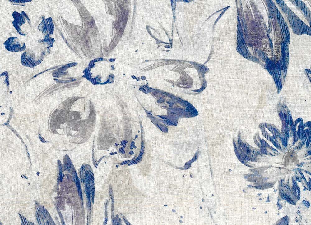 Fastvævet blød viskose hør mix i natur struktureret look med halv stort vandfarvet blå mønster.