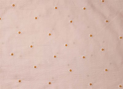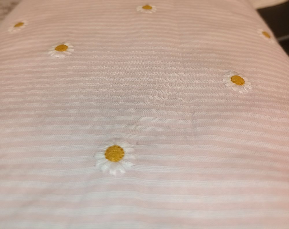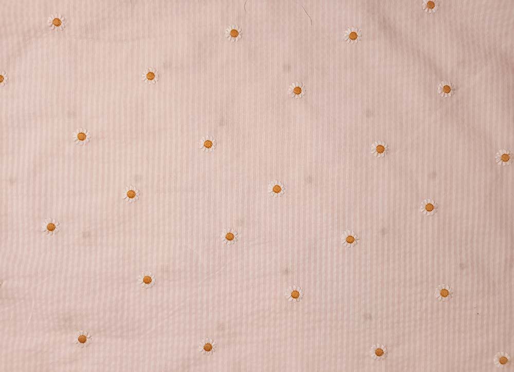 Fastvævet blød og let bomuldsstof med smalle lyserøde og hvide striber og broderet marguerit blomster.