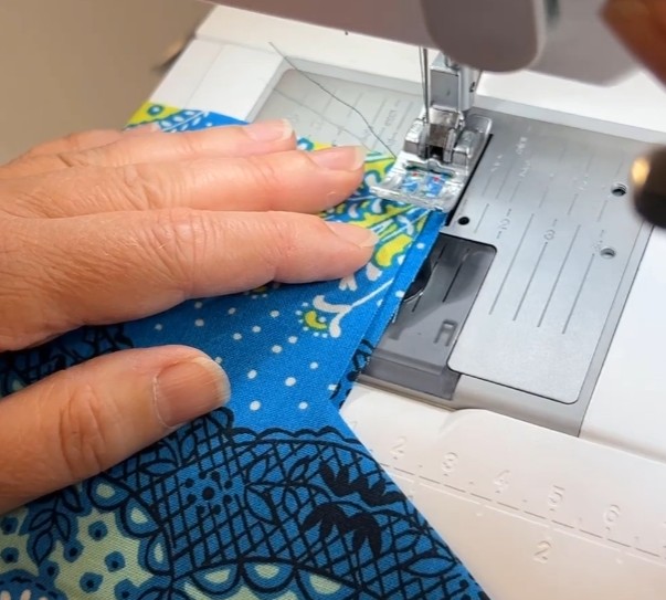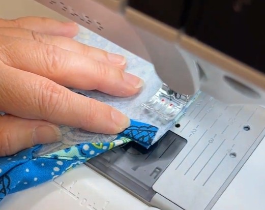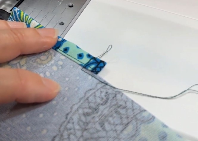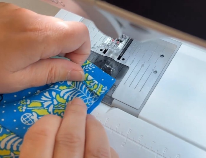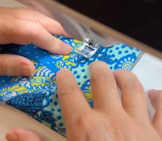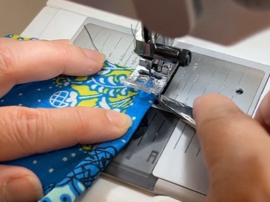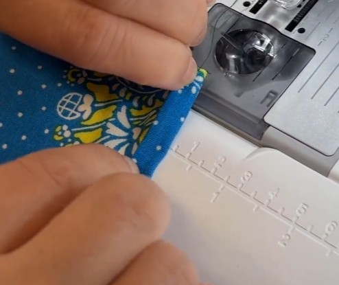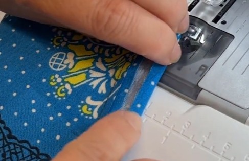 Fold til lukning og stik hele vejen rundt tæt på kanten – dæk den indvendige syning med kantstikningen.