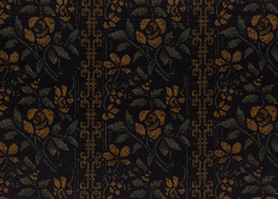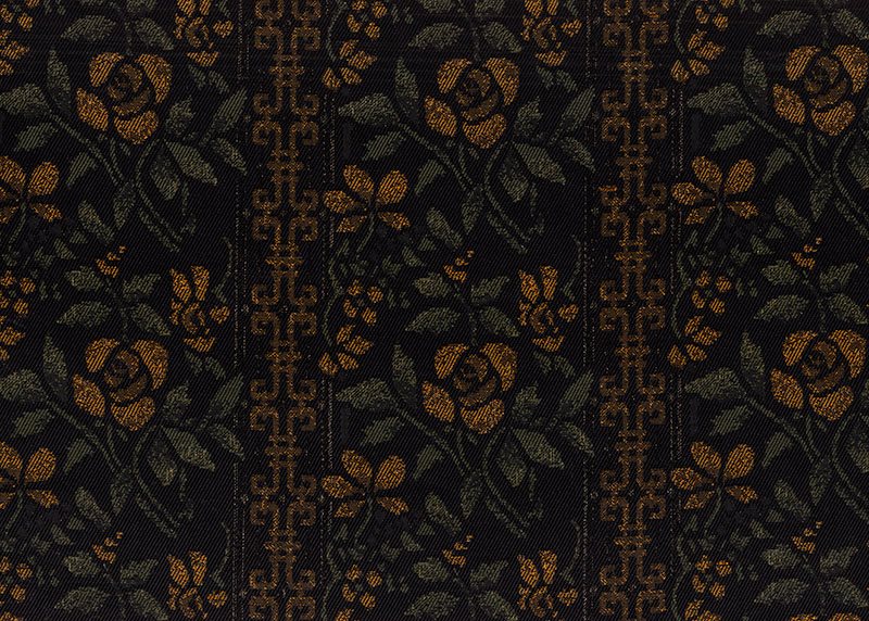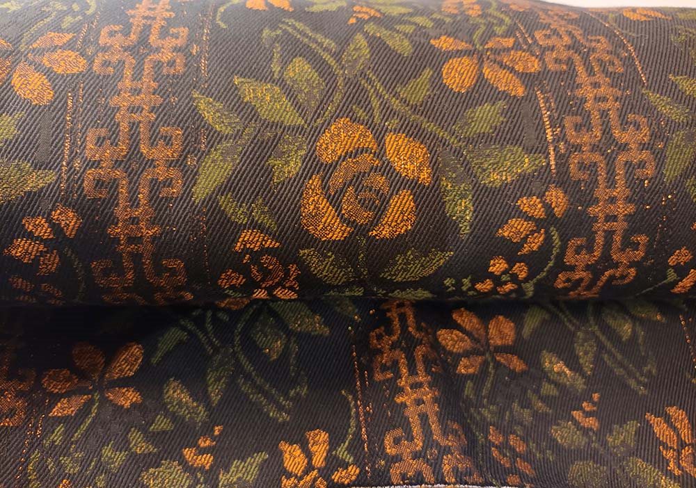 Fastvævet halv kraftig viskose i blåsort baggrund med barog lignende tapet mønster i duset orange med kobber tråd. og grønne blade.