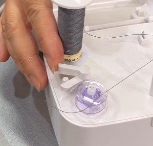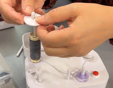 Træk trådpinden op og sæt din trådrulle på. Brug gerne symaskinetråd i god kvalitet, så får du den mest jævne spoling.