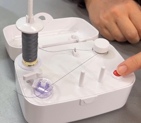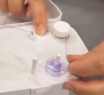 Sæt spolen på holderen og vikl tråden et par omgange manuelt rundt i toppen. Slå fjederen til,