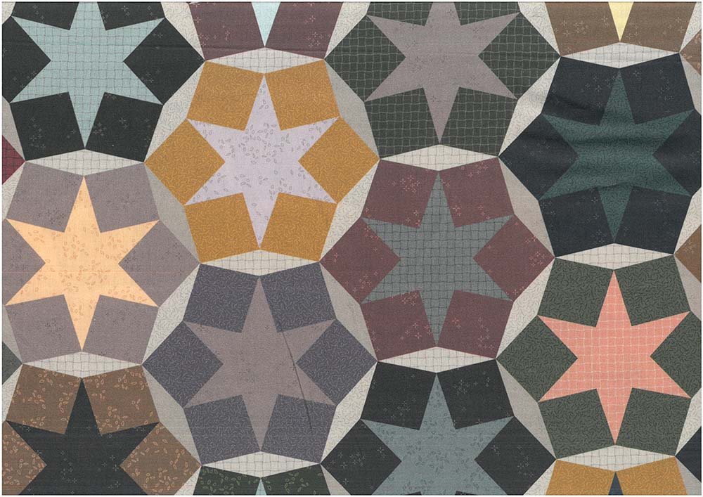 Fastvævet bomuldsstof med patchwork lignende stjerne mønster i forskellige duset farver.