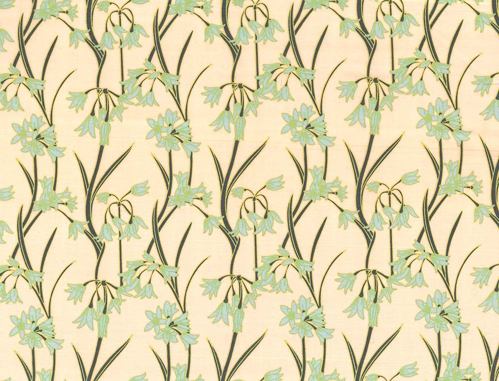 Fastvævet blød bomuldsstof i cremet ivory baggrund med smukke lysegrønne liljer.