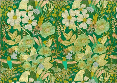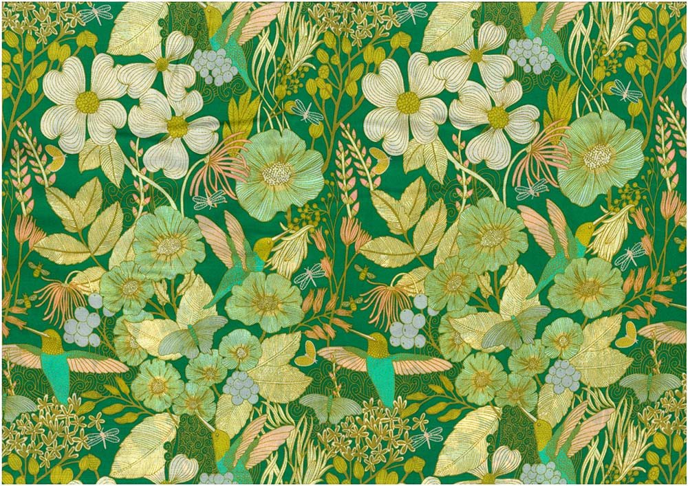 Fastvævet blød og let rayon stof i det skønneste blomster/blade print med kolibrier i grøn gule nuancer med dejlig let fald.