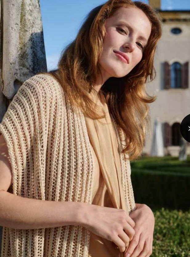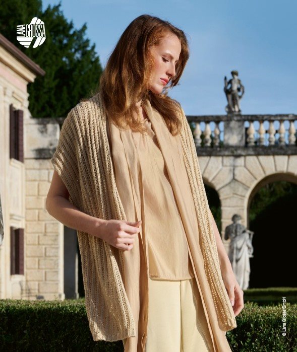 Strikkekit til lang sommervest med hulmønster og sjalskrave i Summer Cashmere (90% bomuld, 10% cashmere) fra Lana Grosa