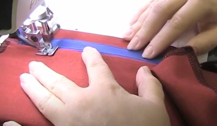 Fastgør lynlåsen til belægningen med en hjælpesøm – brug lynlåstrykfod for at komme tæt på tænderne. Sørg for ca. 1 cm fra topkanten og ned til lynlåsstarten.