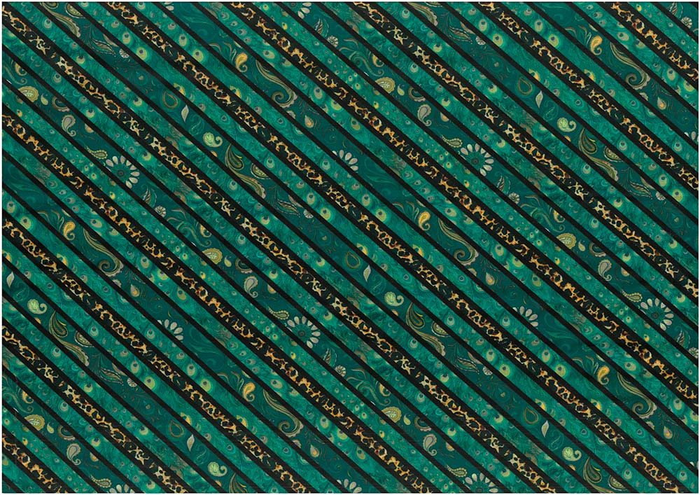 Flot fastvævet bomuldsstof i petrol grønlig skrå striber med paisley mønster, påfugle fjer og lidt leopard ligende print.