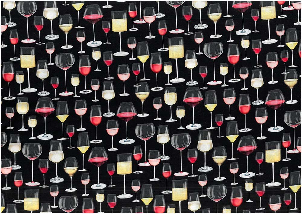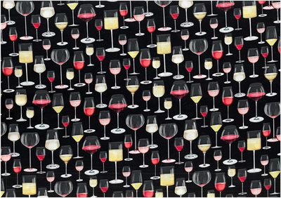 Fastvævet blød bomuldsstof i sort med print af forskellige glas med forskellig vin i.